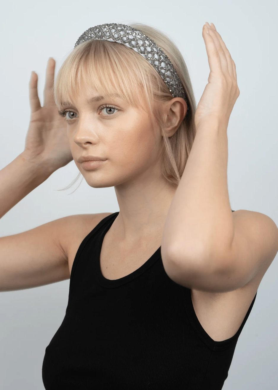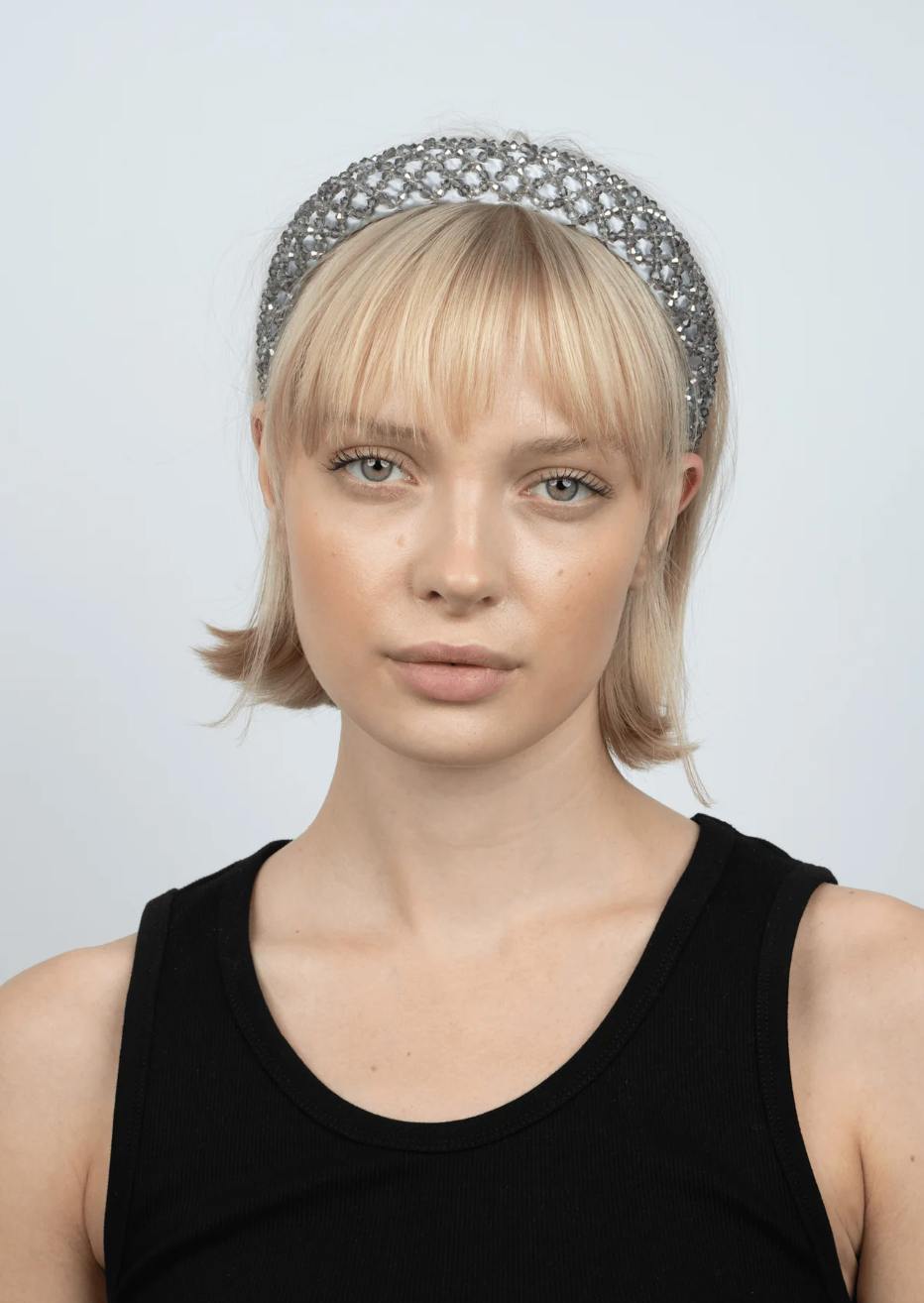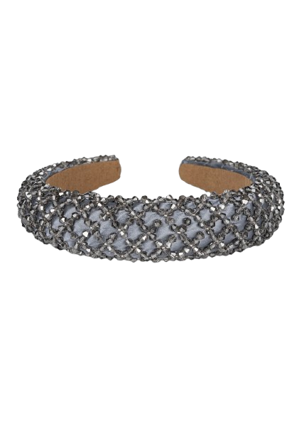 Club Headband er et elegant pannebånd med holdning. Det er dekket av et kjølig grått stoff og dekorert med små, glitrende krystallperler som fanger lyset på den vakreste måten. Designet er både klassisk og kult – og gir akkurat den rette mengden glamour til antrekket ditt, enten det er mandag på kontoret eller lørdag kveld med venner 🩶