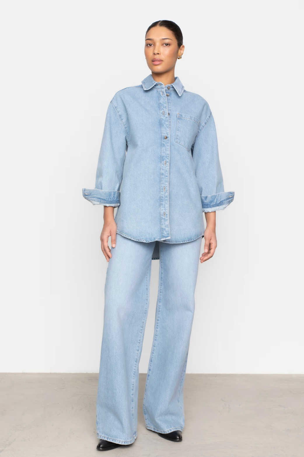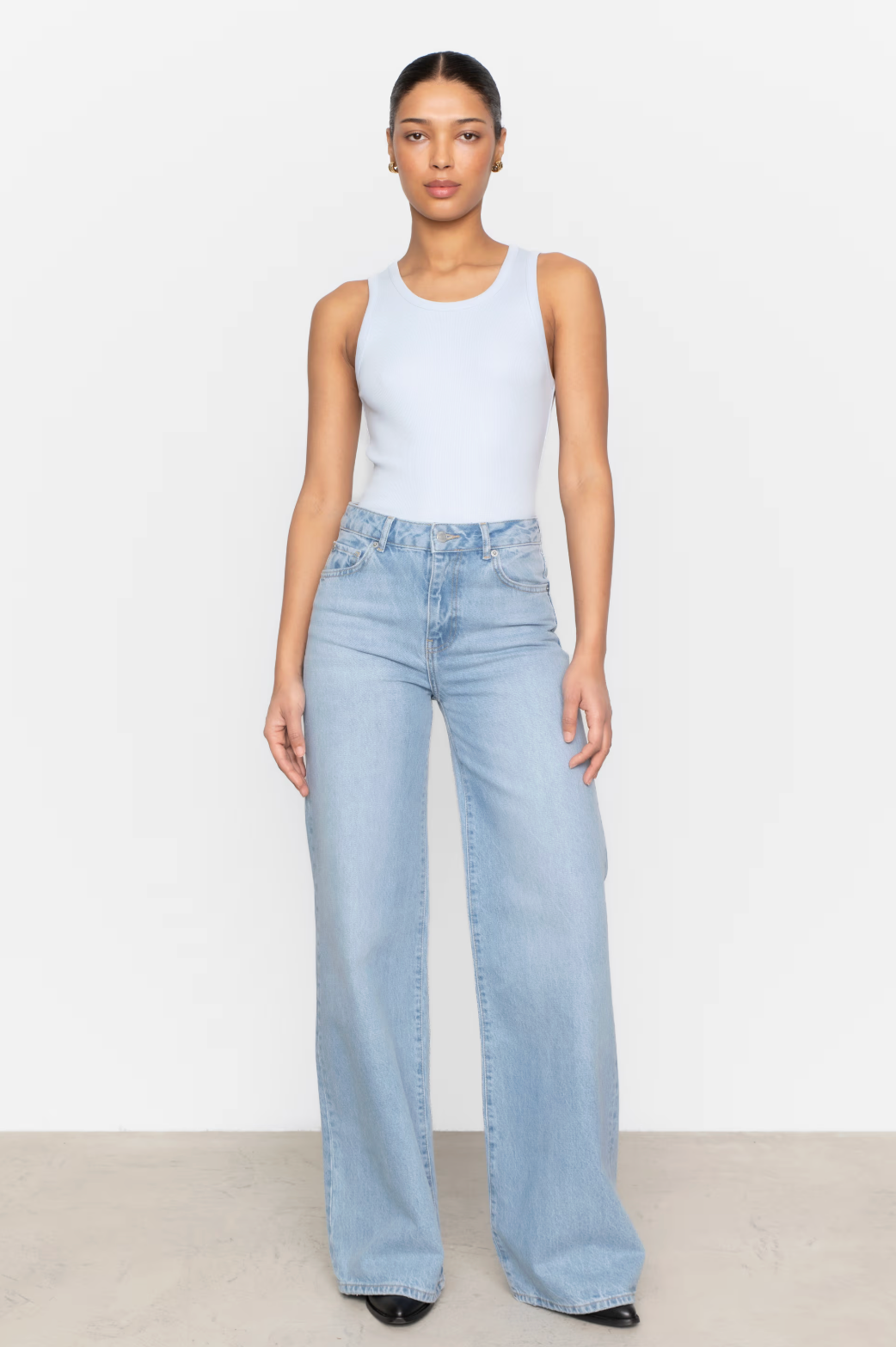 Studiomodellen har på seg størrelse 27/34 og er 176 cm høy.