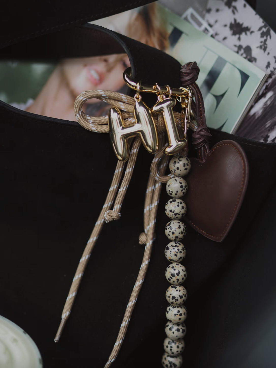 En slitesterk hjerteanheng kombinert med en sløyfe i snor og en perlekjede. Et uanstrengt tillegg til enhver veske eller nøkkelring.