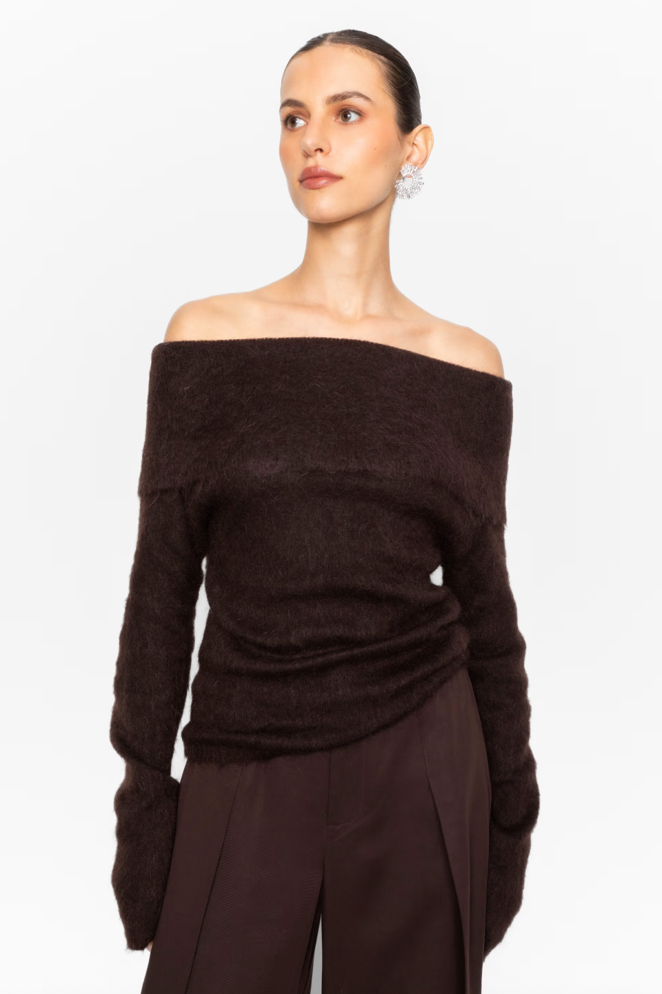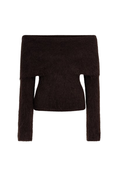 Eliette Off Shoulder Knit har en smal passform, strikket av en delikat børstet mohairblanding. Designet med ribbet brett over halsen.