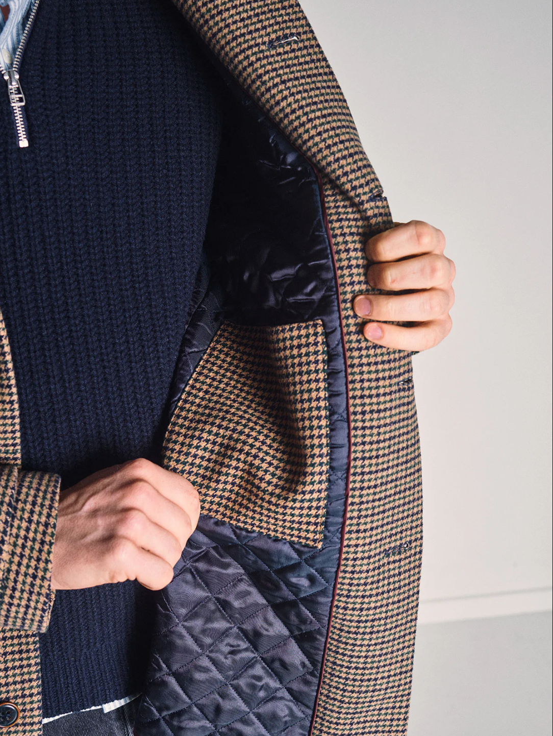 Designet i en klassisk Melton-vev, har den et lett quiltet fôr for ekstra komfort og isolasjon, mens de varme flanellfôrede lommene gir et luksuriøst preg på kaldere dager. Finishdetaljer som merkede hornknapper og den signaturfargede Blue de Gênes-flaggnaglen fullfører utseendet med diskré autentisitet.