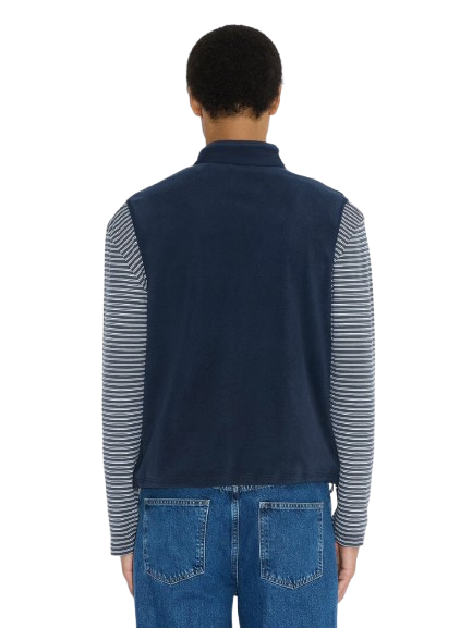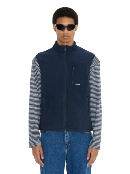 Denne sesongen har Holzweiler utvidet sitt utvalg av yttertøy med allsidig design som Dovre Fleece-vesten. Laget av pustende, men isolerende resirkulert fleece, har den høy hals, glidelås foran, glidelåslommer, Polartec®-logobroderi på brystet, en justerbar fald og den er foret med et skinnende teknisk stoff.