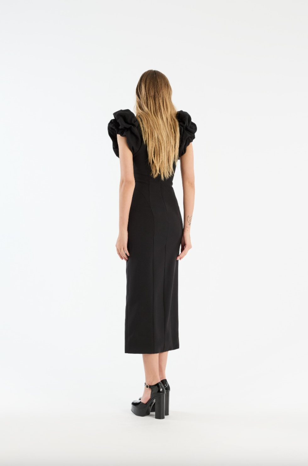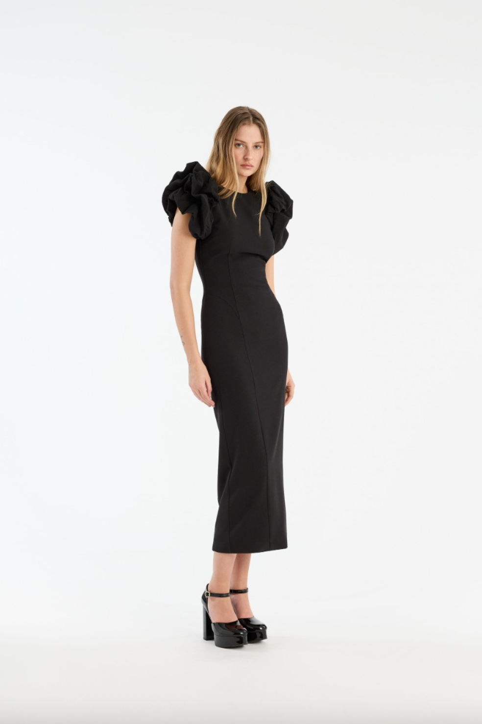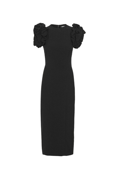 Crepe Puffy Midi Dress Black er en tettsittende midikjole med dramatiske puffermer. Ermene er laget av rynket crepe og plassert høyt på skuldrene for å skape en voluminøs silhuett. Den har en rund hals, formende sømmer gjennom kroppen og lukkes med en skjult glidelås bak. Kjolen har fôr.