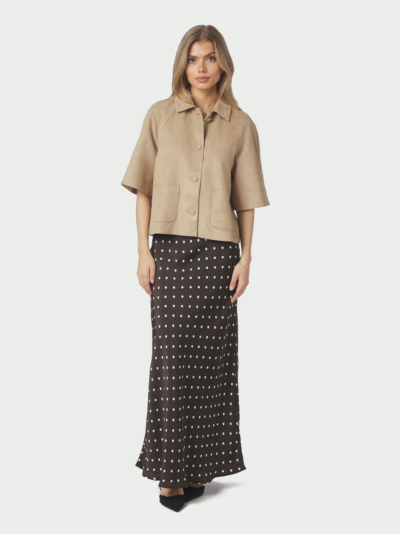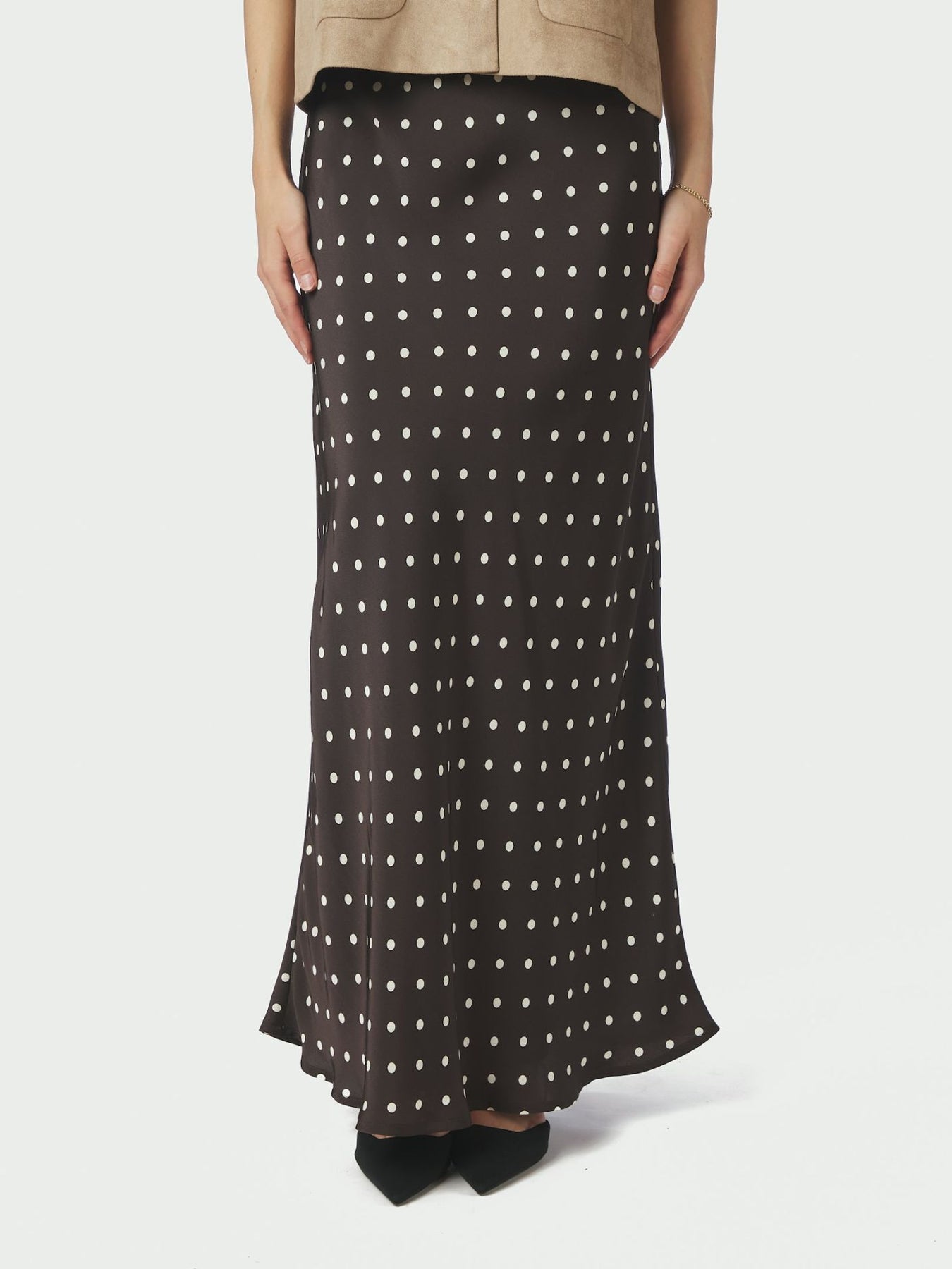 Langt prikkete skjørt med elastisk midje. Skjørtet er skråstilt og har en veldig flatterende passform. Modellen er 176 cm høy og bruker størrelse 36.