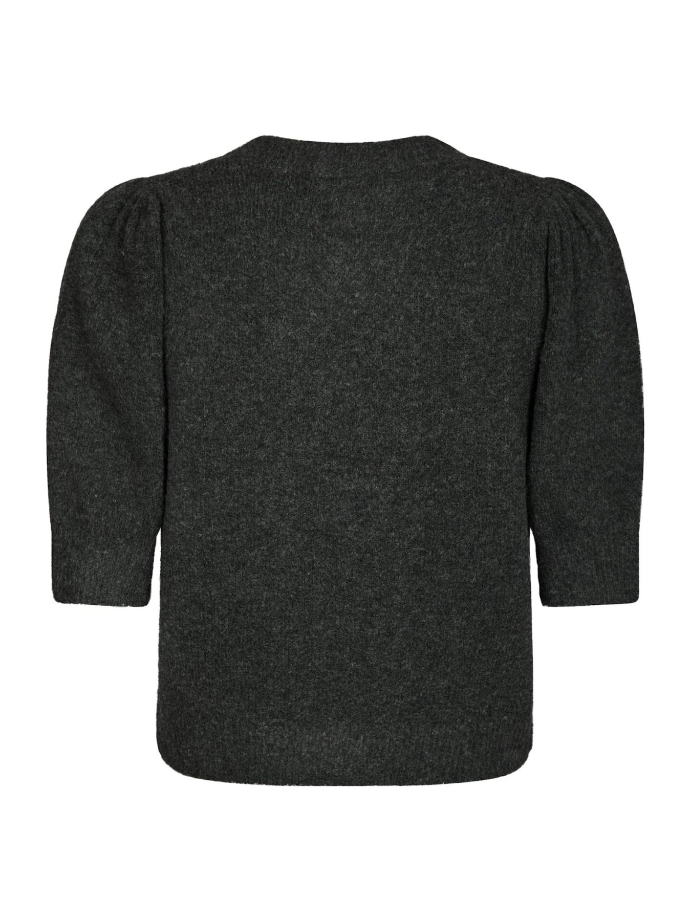 Søt liten strikket cardigan med korte ermer og små dekorative knapper i frontlukningen. Modellen er 176 cm høy og bruker størrelse 36.