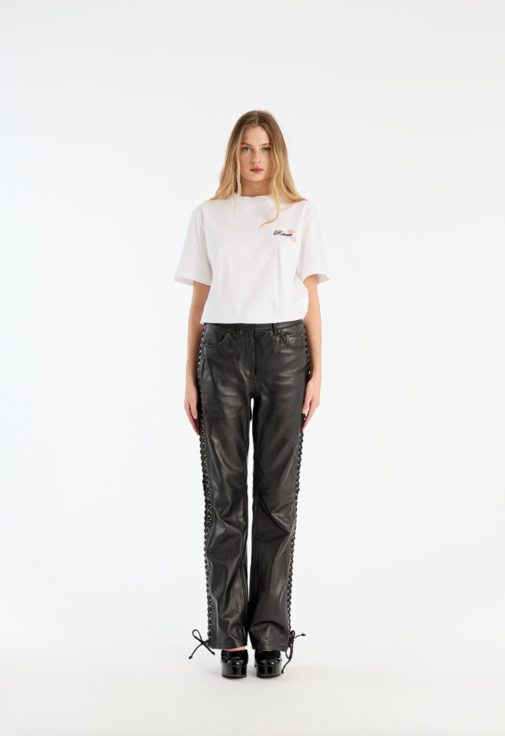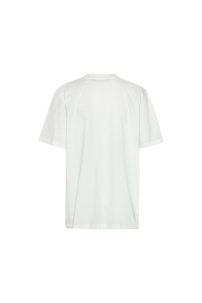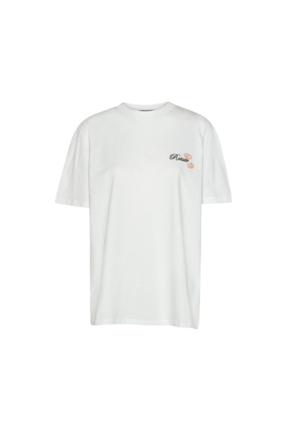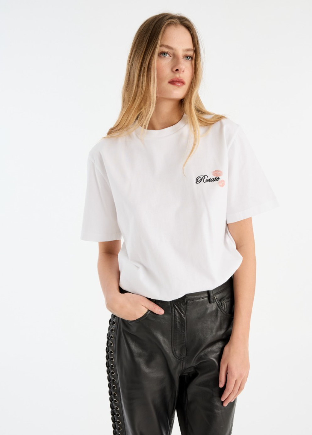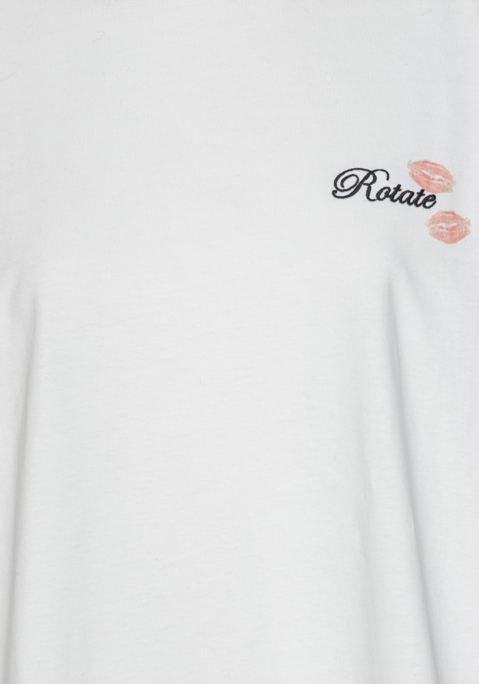 Oversized T-skjorte i Bright White er laget av økologisk bomull og har en firkantet silhuett med senkede skuldre og en klassisk rund hals. En liten ROTATE-logo og trykte kyssemerker vises på brystet. Designet med korte ermer og en rett kant.