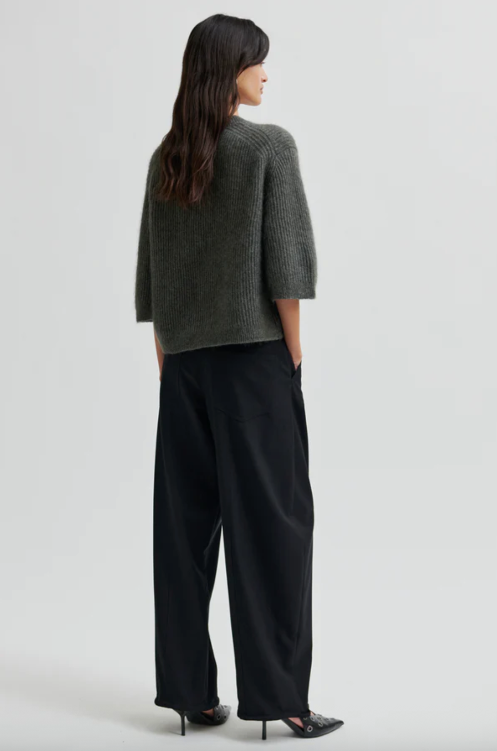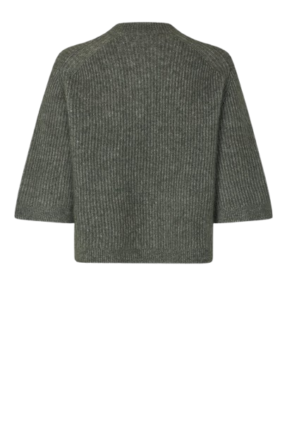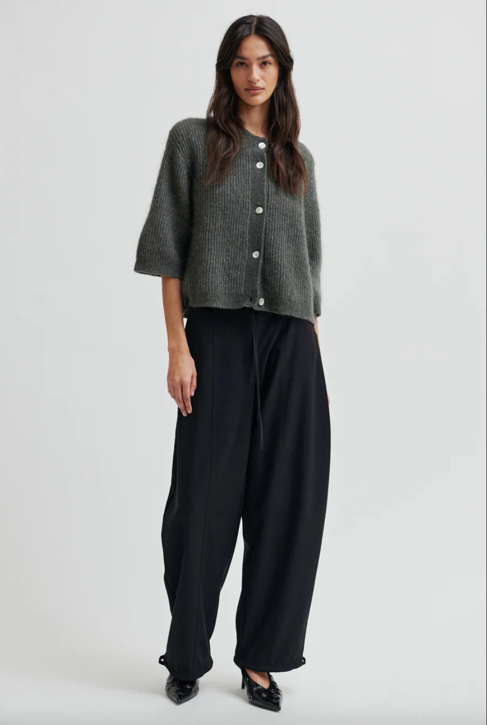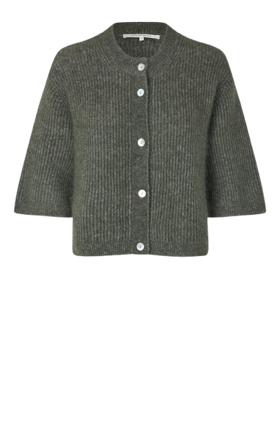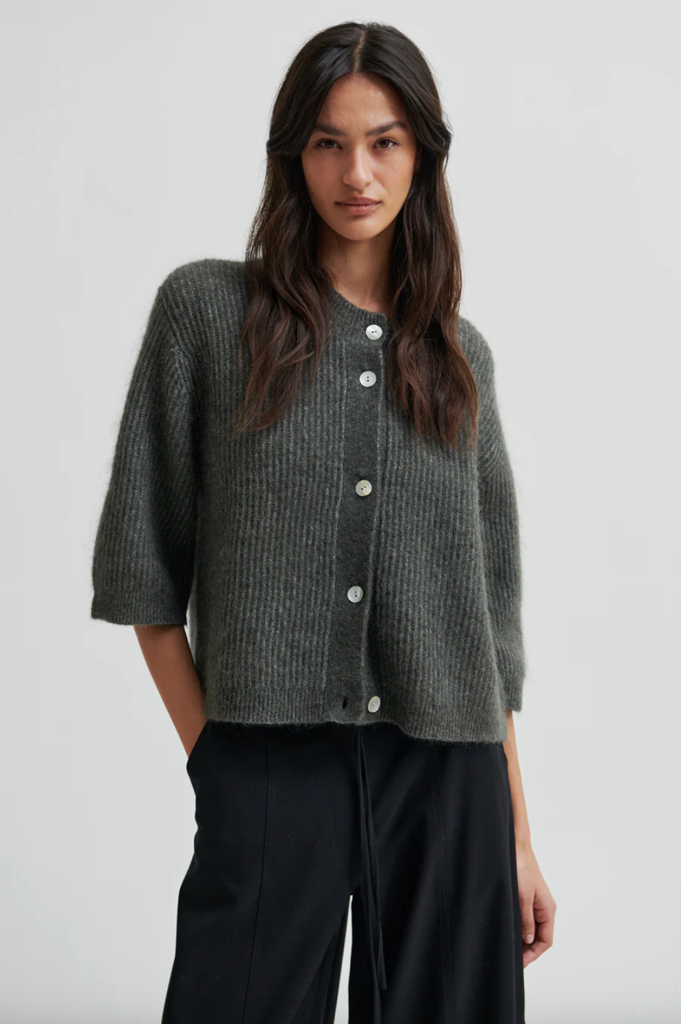 Kortermet ribbet cardigan fra Second Female. Cardiganen er laget i en myk mohair- og ullblanding med ribbet struktur. Har rund hals og knappelukking med perlemorknapper. Senkede skuldre. Vanlig, litt firkantet passform.