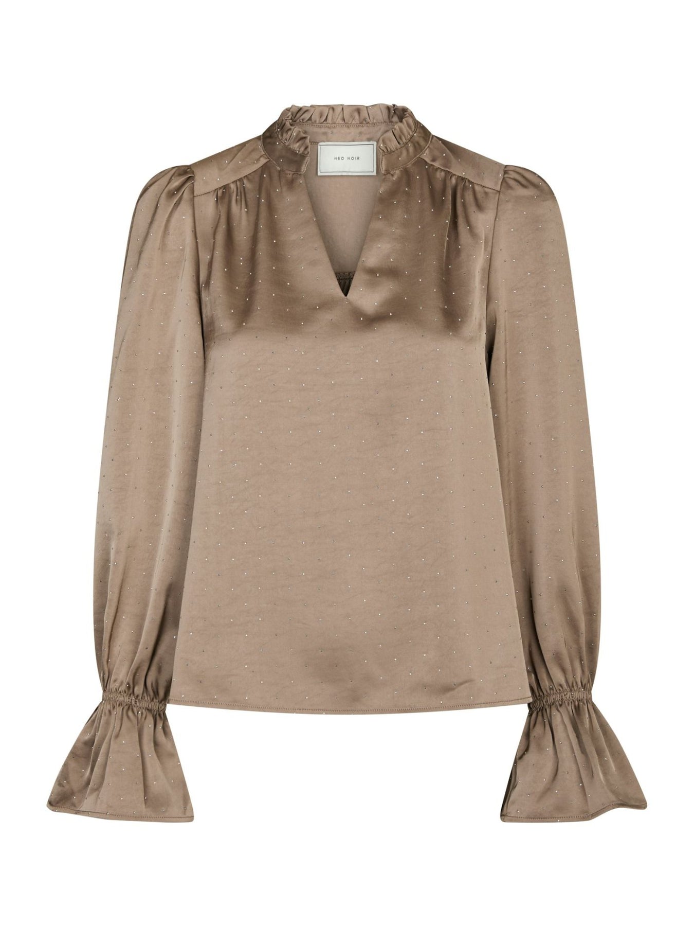Fin feminin bluse i satin kvalitet med steiner. Blusen har lange ermer og v-hals. Modellen er 176 cm høy og bruker størrelse 36.
