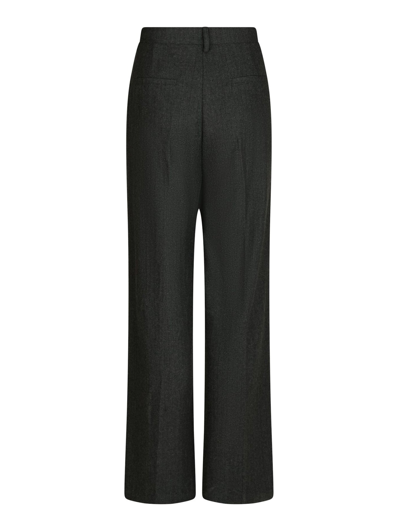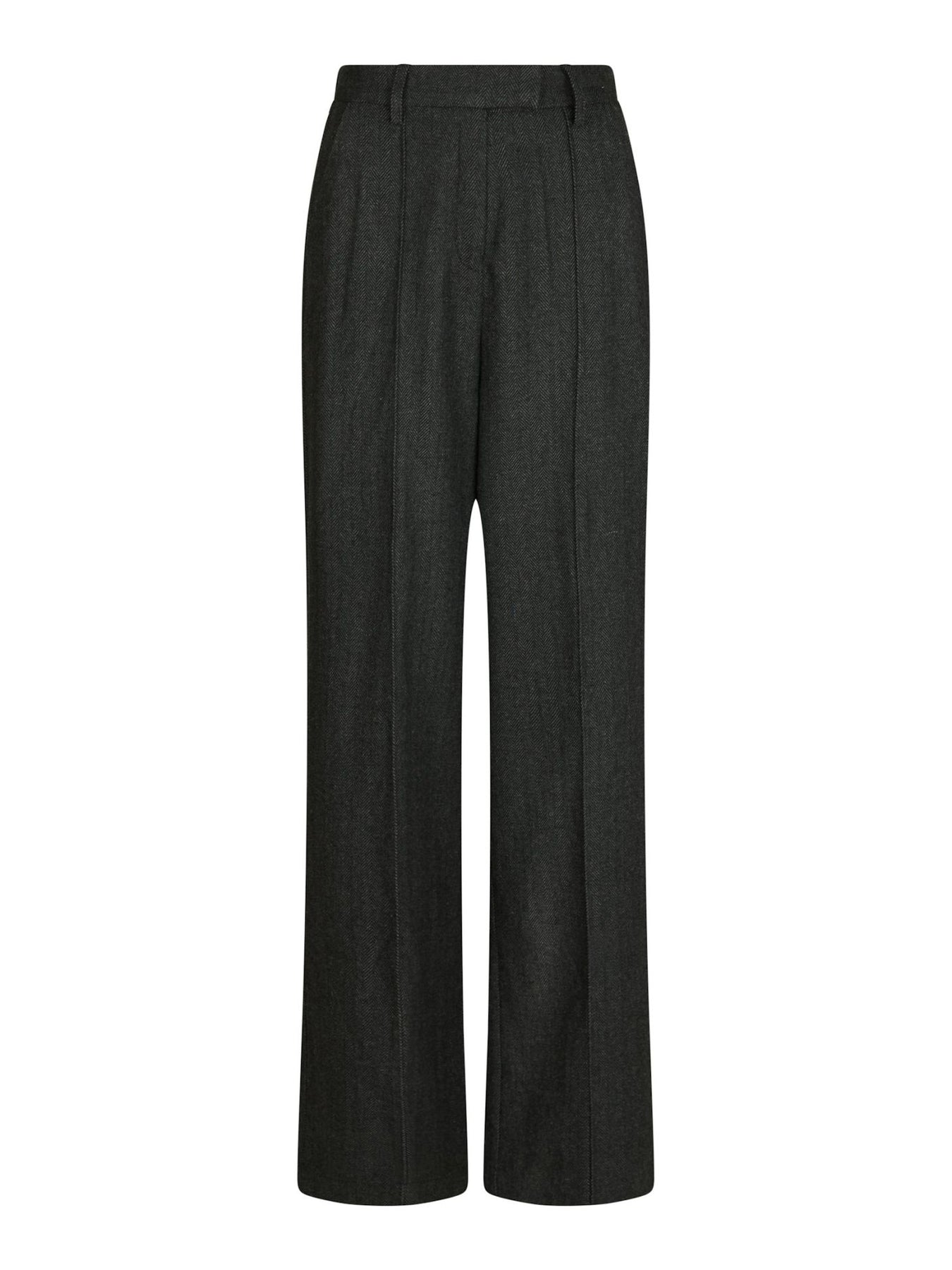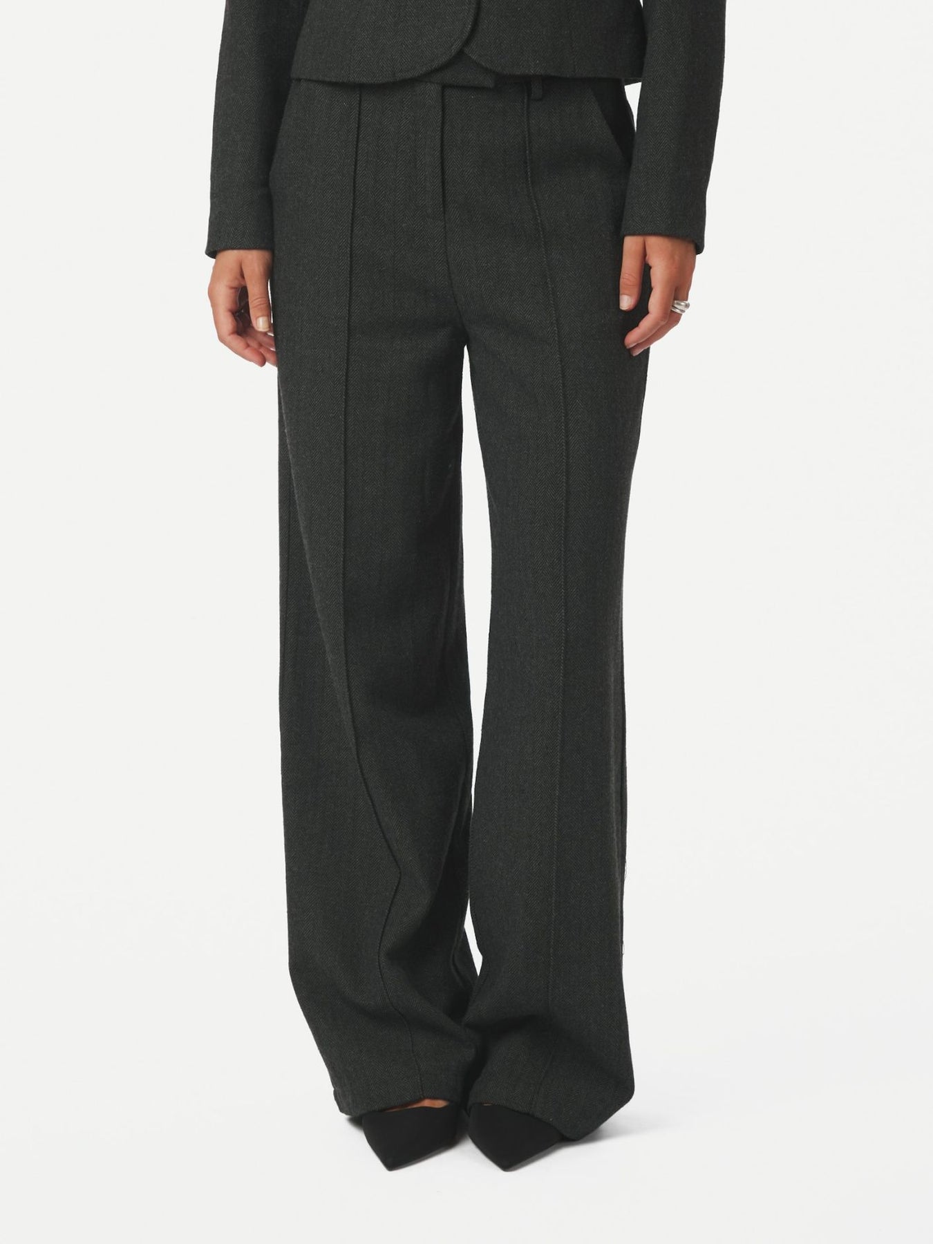 Mellomhøy midjebukse med vide ben i fin fiskebenskvalitet med sydde trykklinjer. Midjen kan justeres med en innvendig strikk. Modellen er 176 cm høy og bruker størrelse 36.