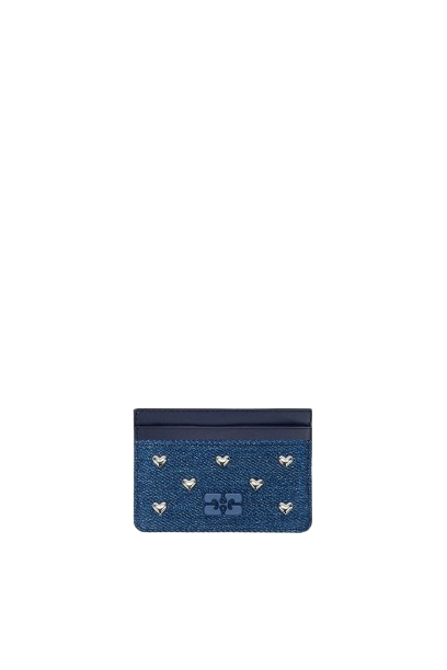 Kortholderen har flere kortlommer, en GANNI «Butterfly»-metallogo og metalliske, hjerteformede nagler.