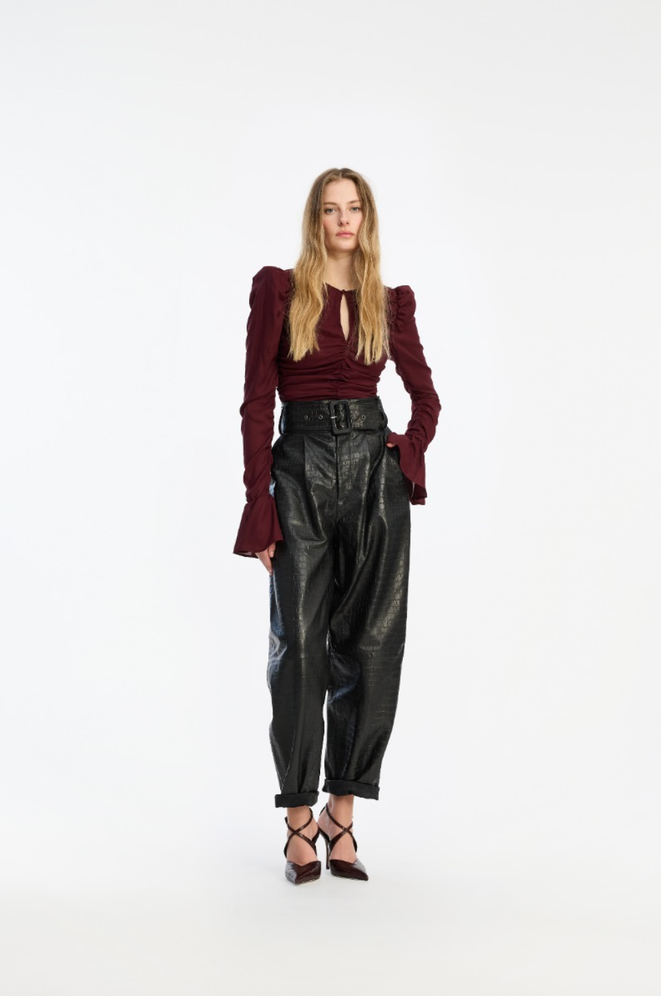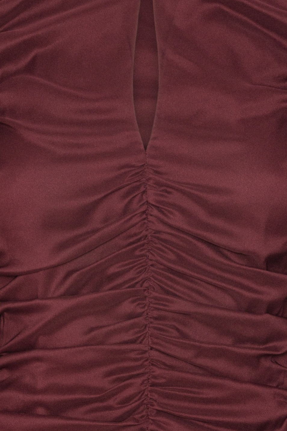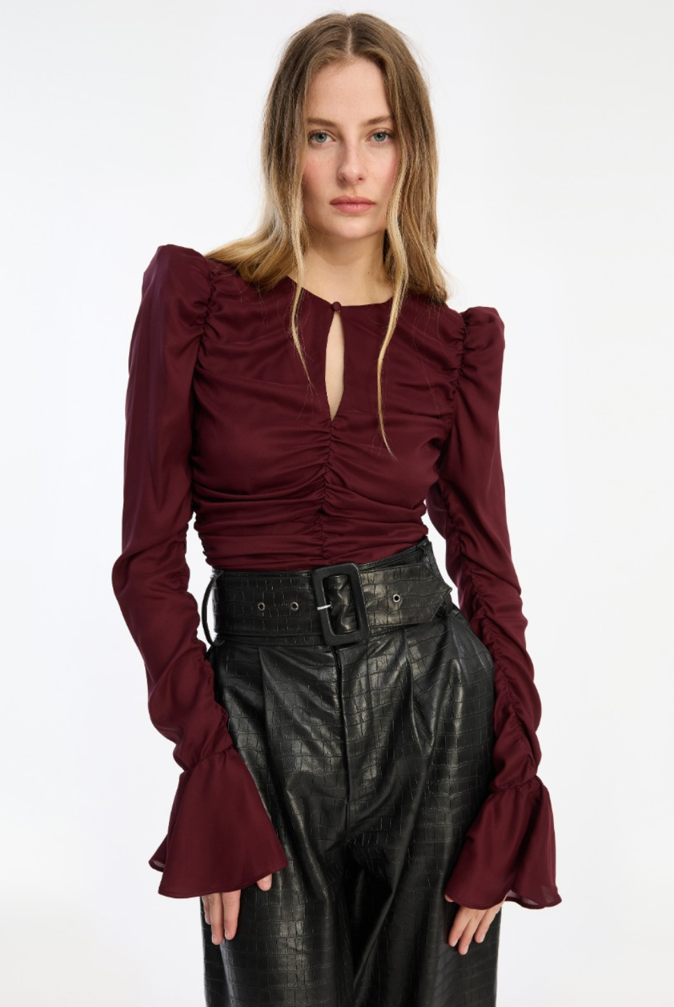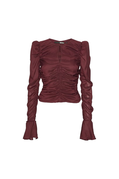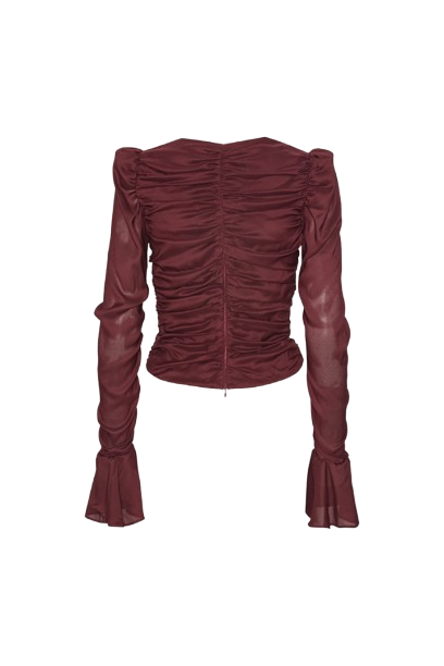 Chiffon Ruched LS Top Burgundy har lange ermer med rynkede detaljer og utsvingte mansjetter. Designet med rund hals og dråpeformet åpning foran, har den rynkede sømmer foran, bak og på ermene. Lukkes med glidelås bak. Sammensetning 1: 100 % polyester (resirkulert)