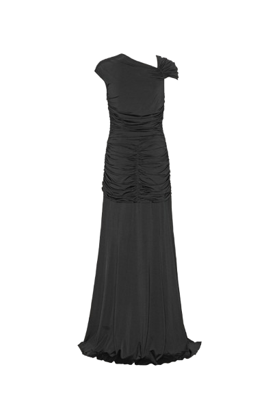 Maxi Asymmetrisk Kjole Svart har en asymmetrisk halsutringning med én samlet skulder og en tettsittende, rynket overdel. Skjørtet faller over i en hel silhuett med myk drapering og en boblelignende kant. Ryggen er detaljert med samlet rynking over den nedre delen, noe som gir definisjon og form. Kjolen har fôr.