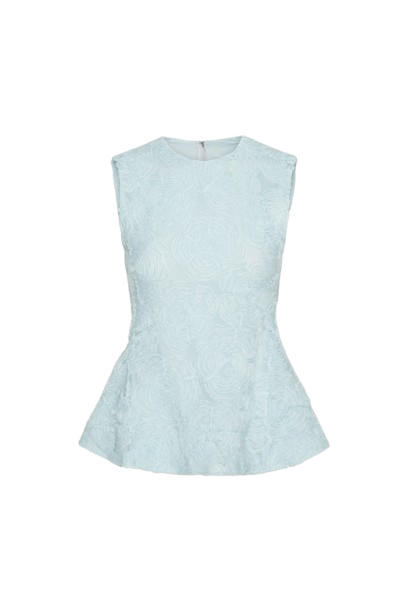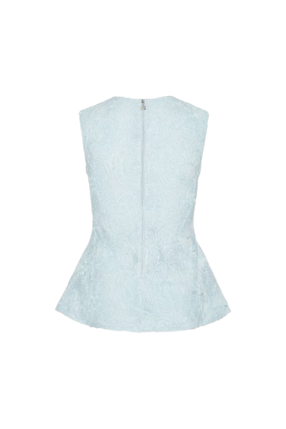 Mesh Sleeveless Top Blue er en ermeløs topp med rund hals og en tettsittende midje som utvides til en diskret peplumkant. Designet har en heldekkende teksturert nettingoverflate med blomstermønster og en ren glidelåslukking bak.