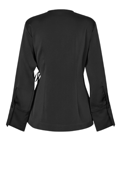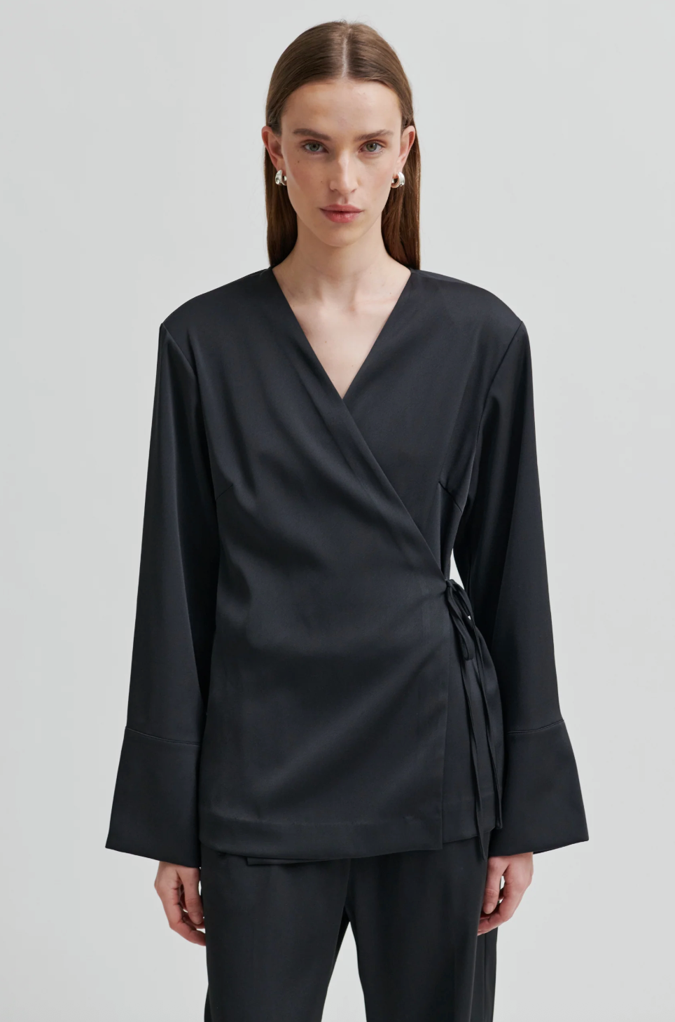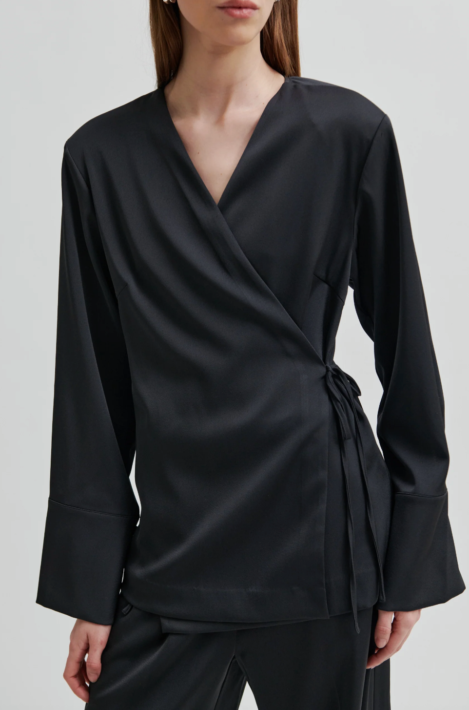 Draperende crossover-skjorte fra Second Female. Skjorten er laget i et glatt stoff med luftig kvalitet. Med en crossover-klaff foran som knytes på den ene siden. Skulderputer og lange ermer med brede, justerbare mansjetter. Normal passform.