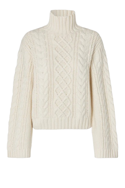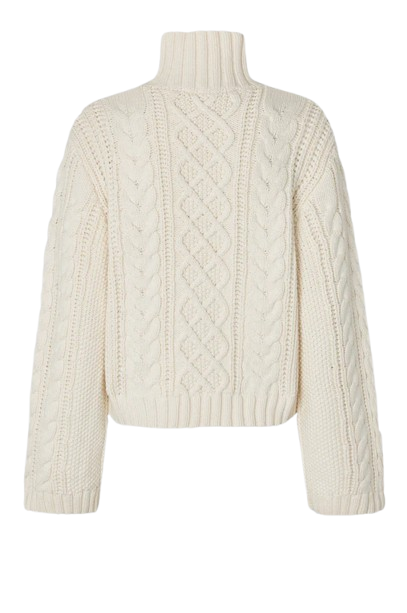 Kabelstrikket genser fra Second Female. Genseren er laget i en myk bomullsblanding med grov strikk og kabeldetaljer. Har høyhalset hals og vide, lange ermer. Ribbestrikket hals, mansjetter og nederst. Vanlig, litt kort passform.