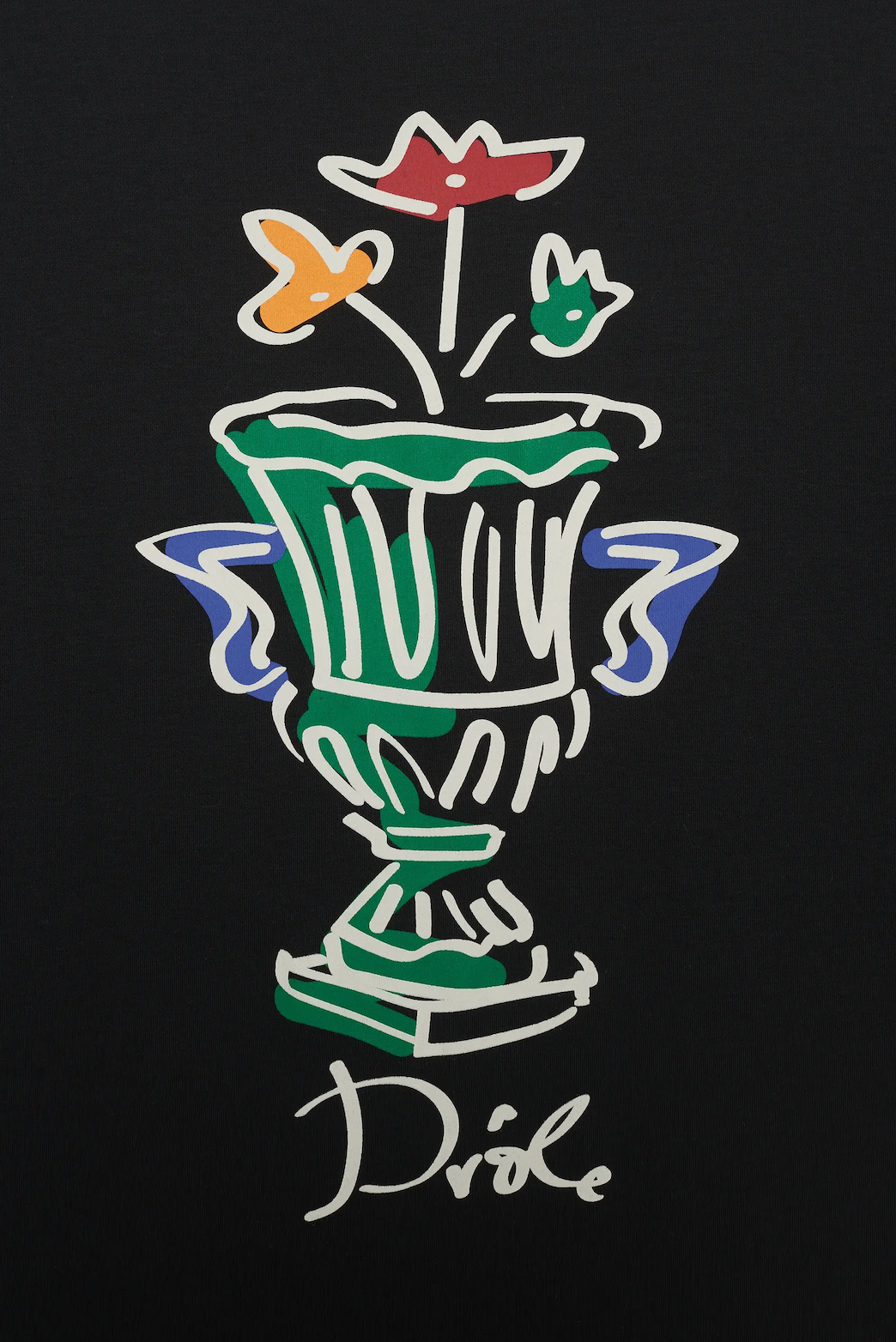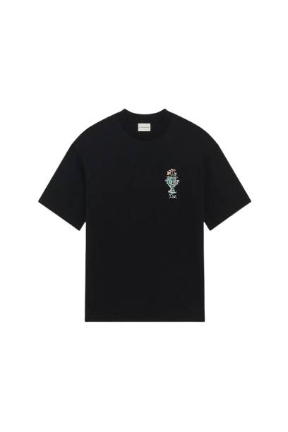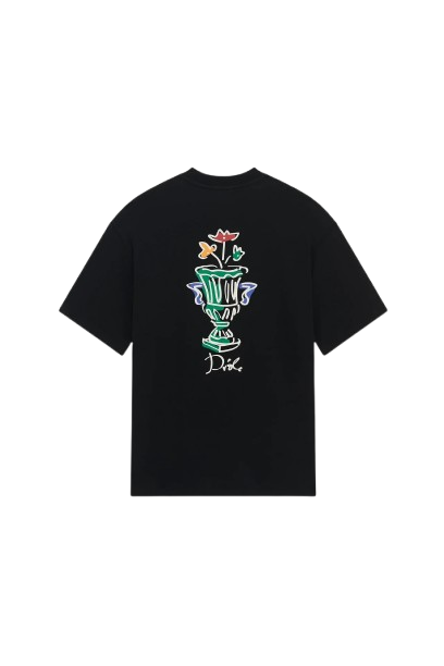 Denne svarte interlock-t-skjorten i 100 % bomull med ribbet hals har vasetrykk foran og bak.