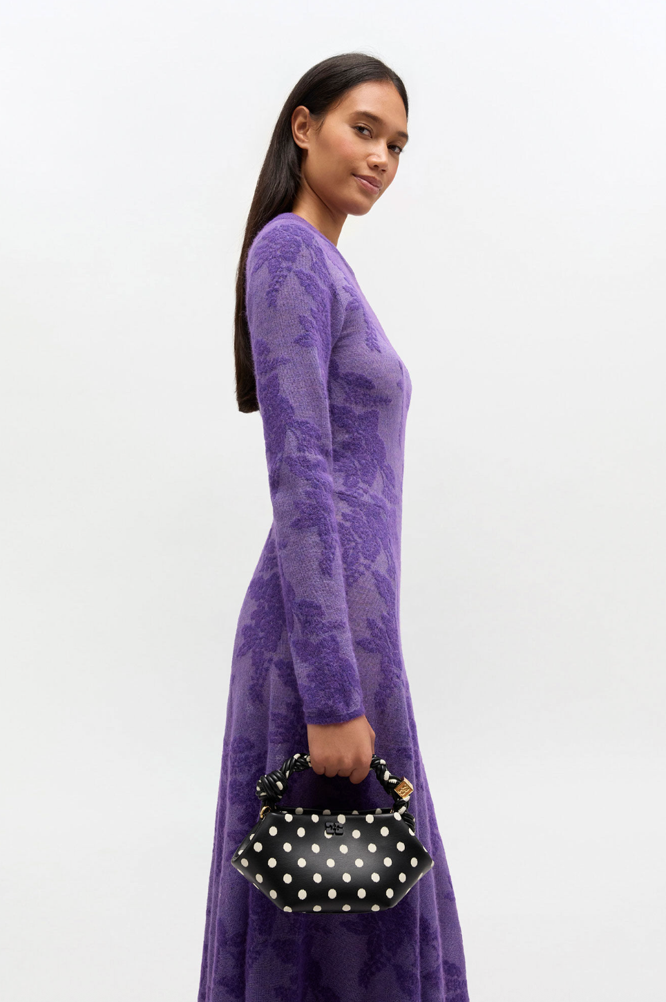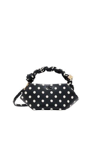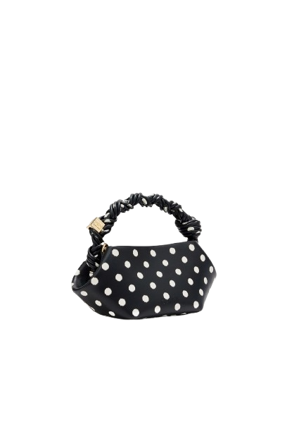 Denne vesken har en ton-i-ton-farget, metallisk GANNI «Butterfly»-logo, et vridd håndtak med en flettet knute og en metallisk terning med en inngravert GANNI «Butterfly»-logo. Vesken har innvendig magnetlukking, en flat kortlomme på innsiden og en justerbar og avtakbar skulderrem for crossbody-bruk