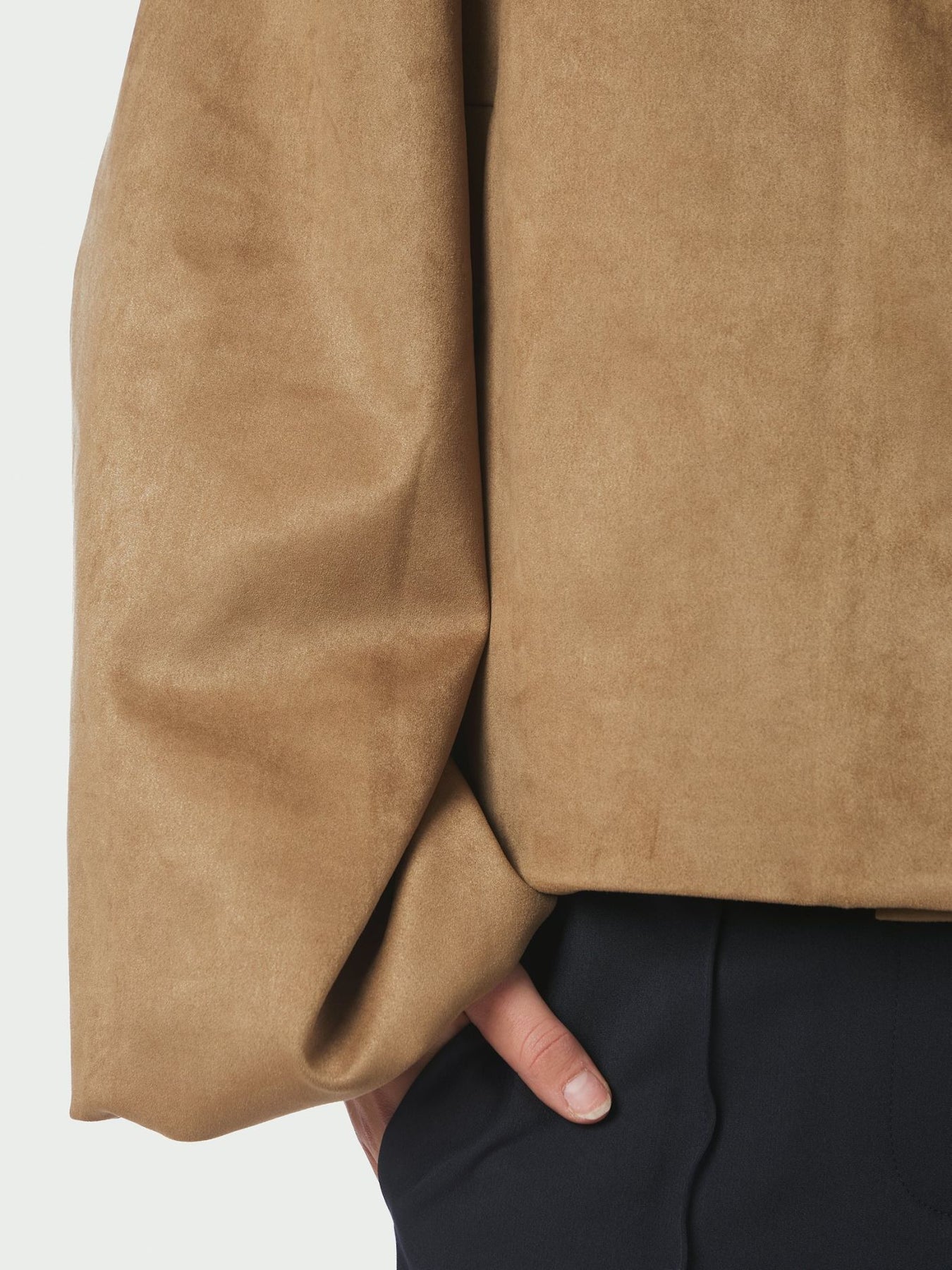 Kort jakke med høy krage. Jakken har frontlommer og en løs passform med vide ermer. Modellen er 176 cm høy og har på seg størrelse 36.