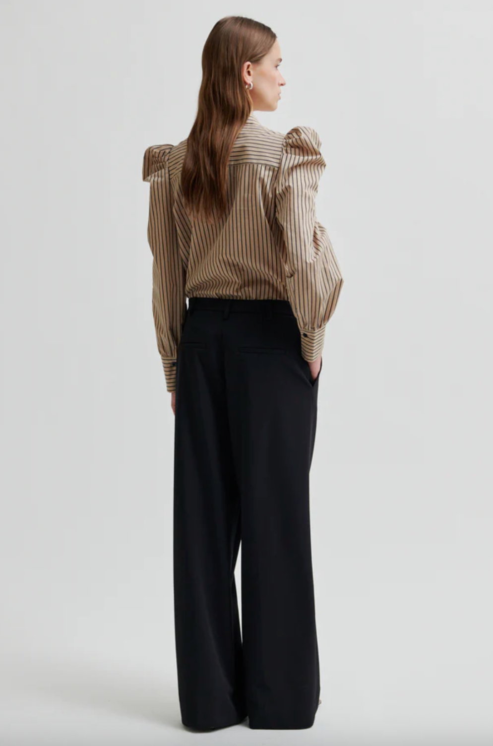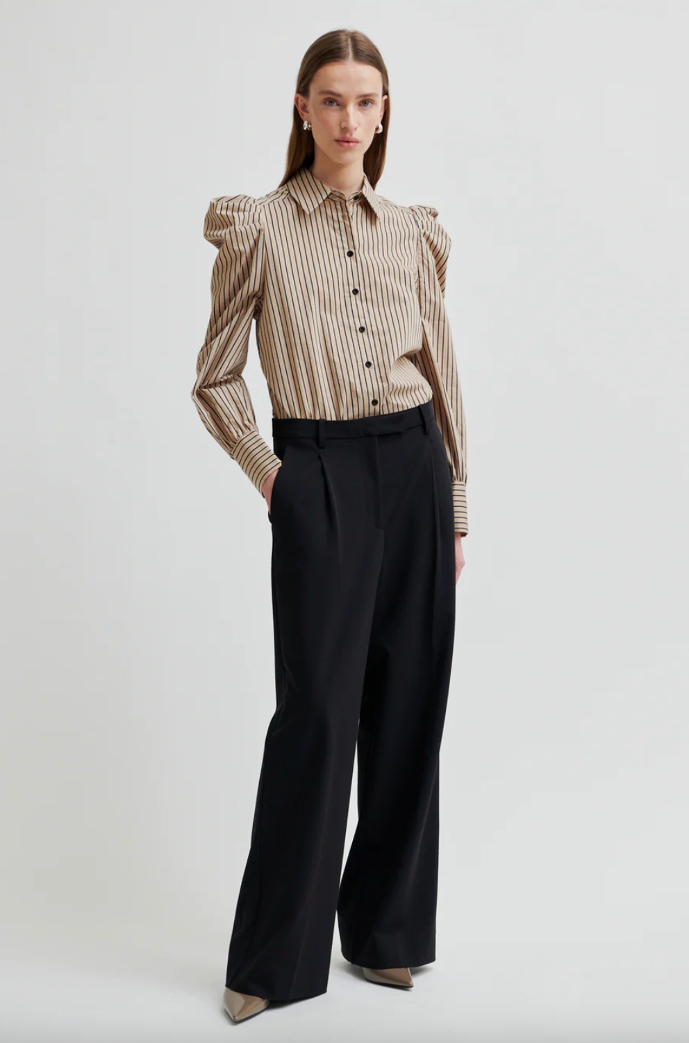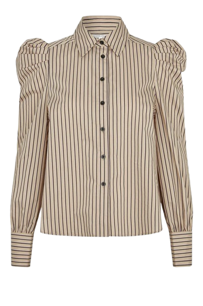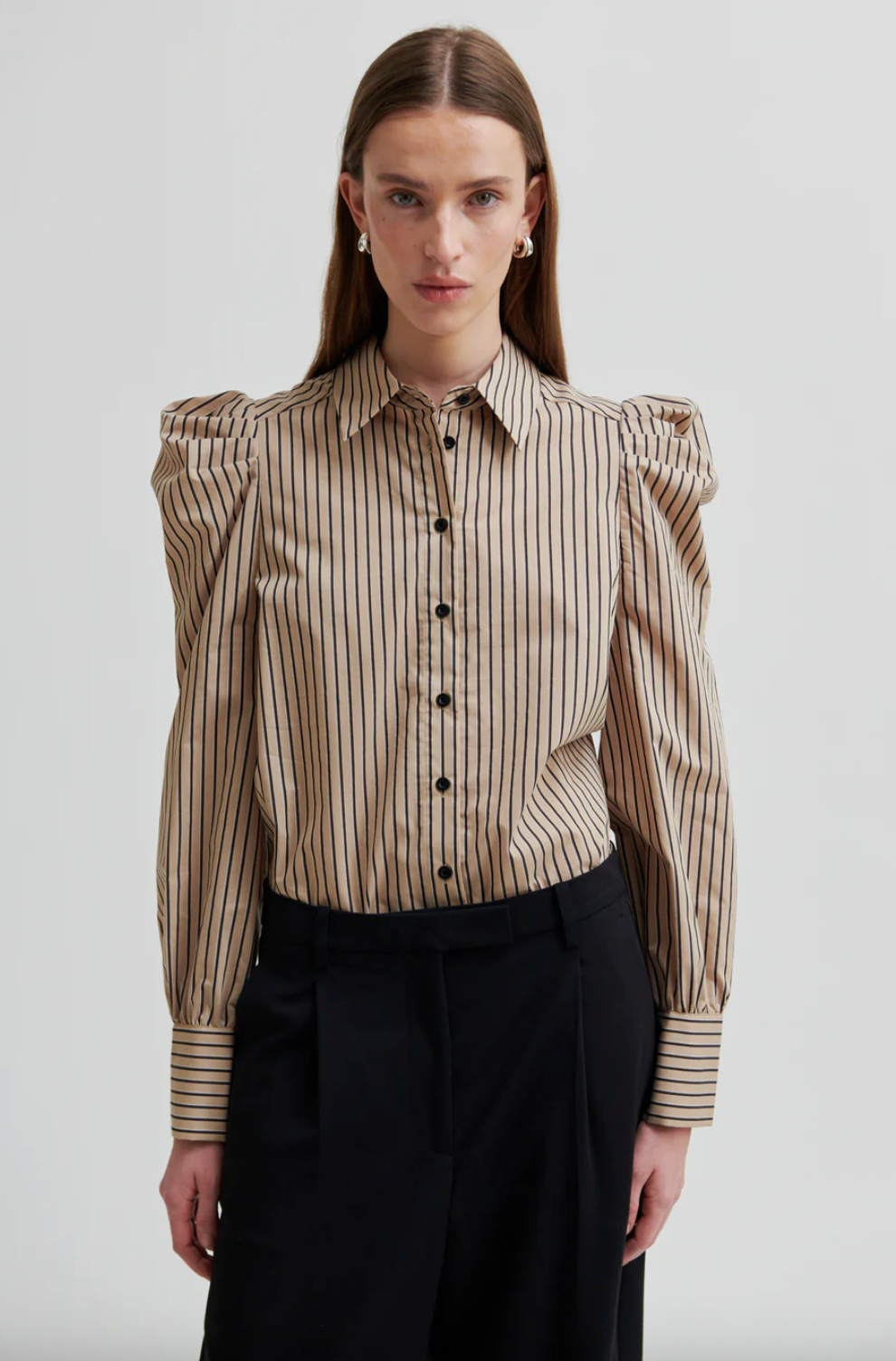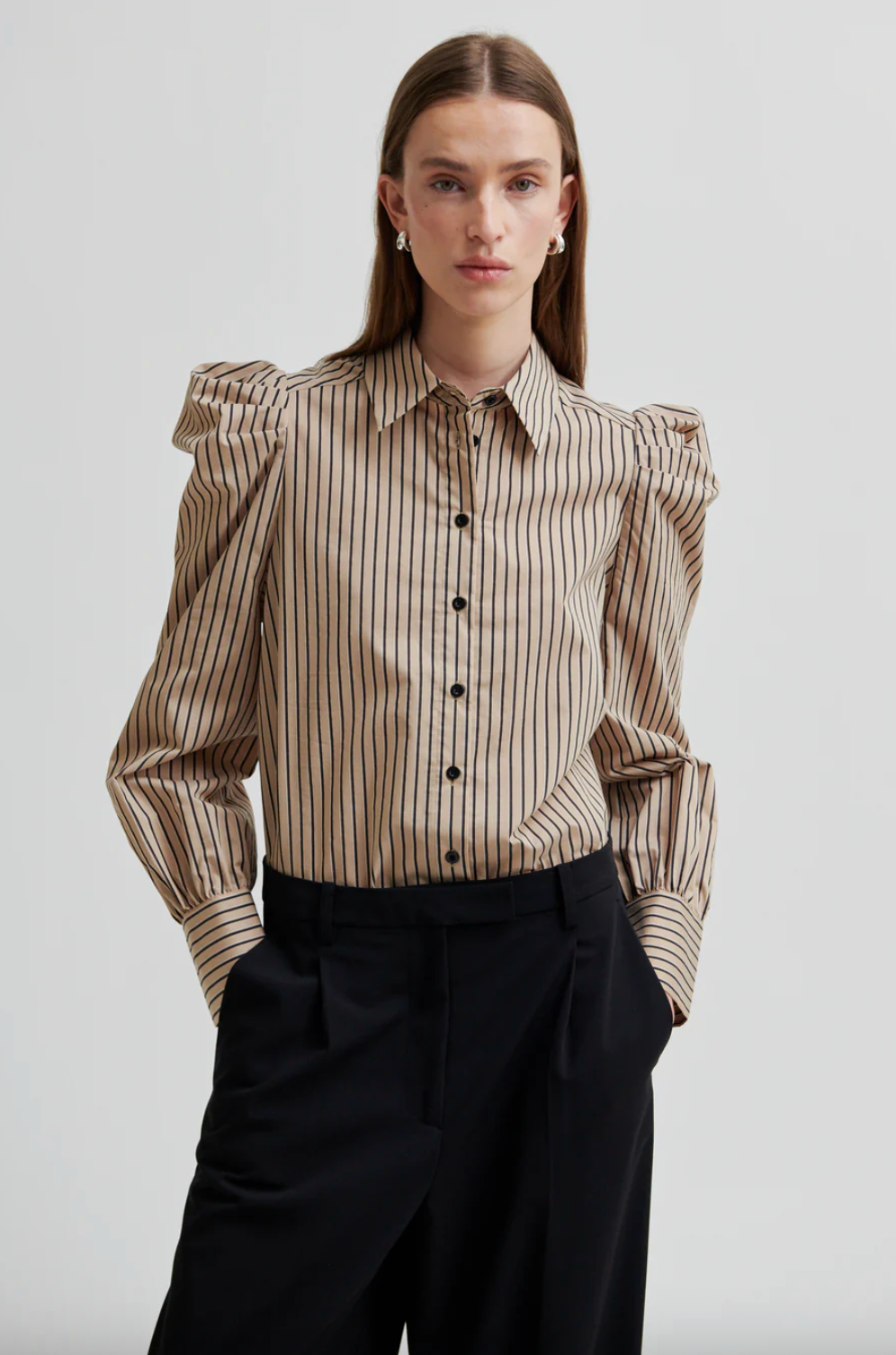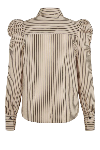 Second Female tettsittende stripete skjorte. Skjorten er laget i en glatt bomullsblanding med heldekkende striper. Med vanlig krage og knappelukking. Puffede skuldre og lange ermer med knapper i mansjettene. Slim fit.