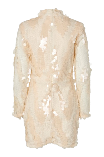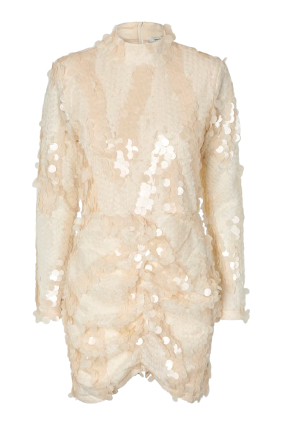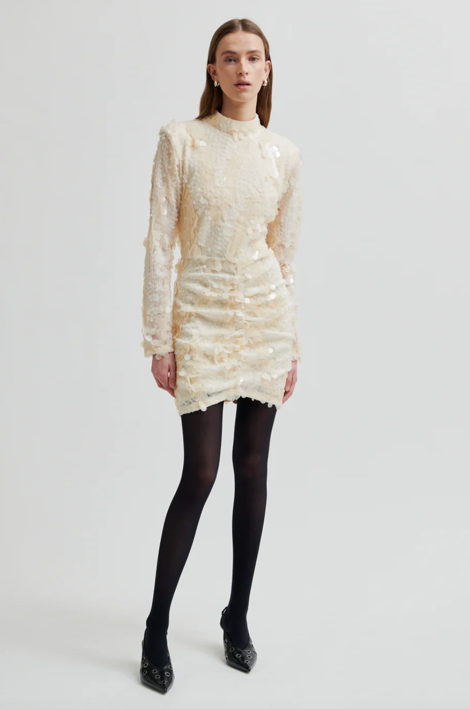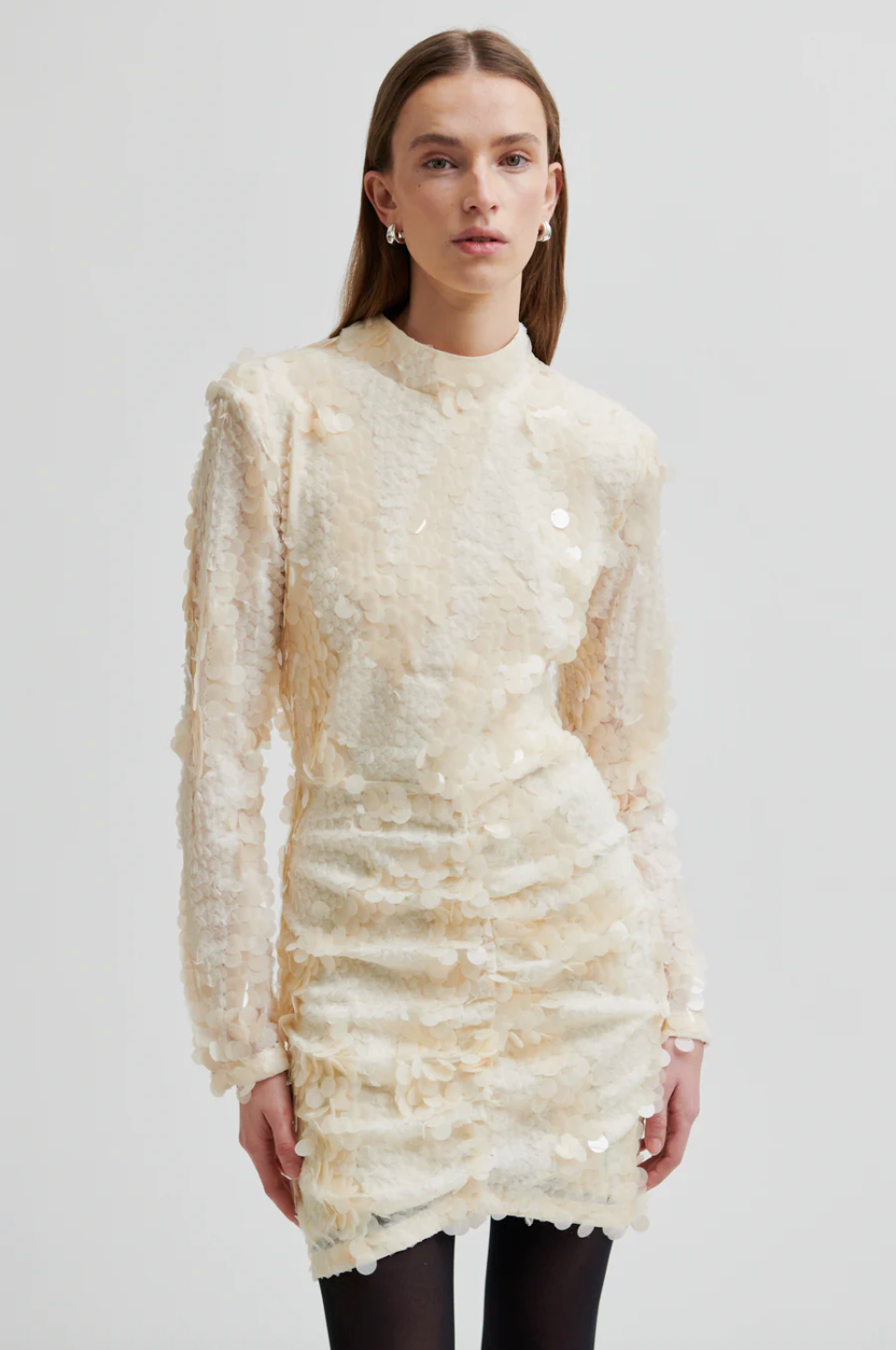 Second Female paljettkjole. Kjolen kombinerer glitrende paljetter og gjennomsiktig 3D-stoff på en ton-i-ton mesh-bakgrunn. Har høy hals og glidelåslukking bak. Rynket søm foran. Skulderputer og lange ermer. Fôret kropp. Slim fit.