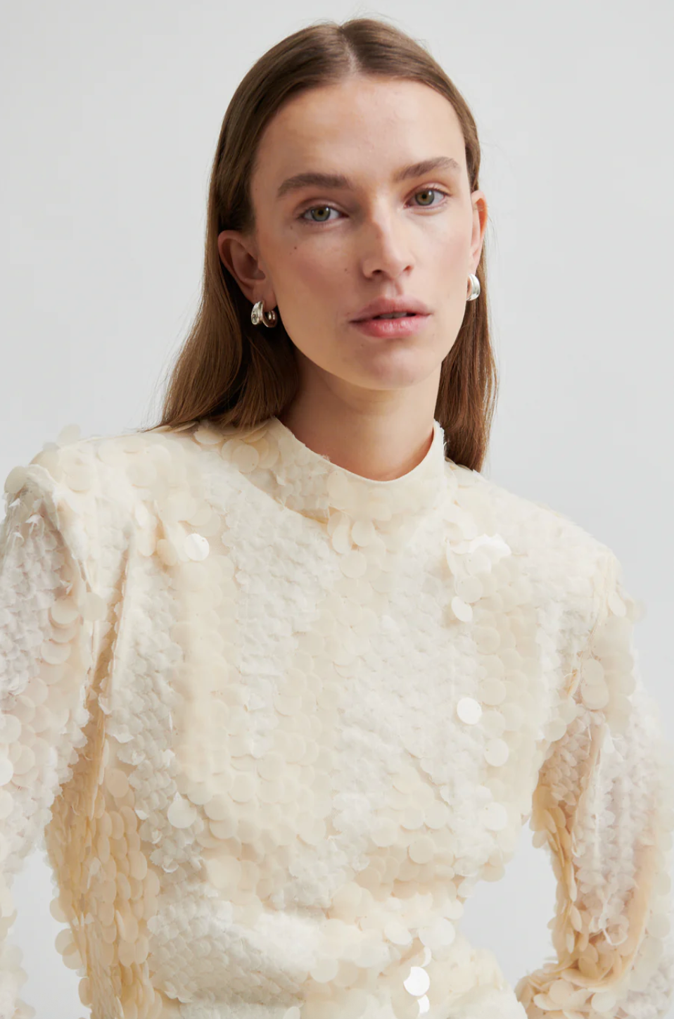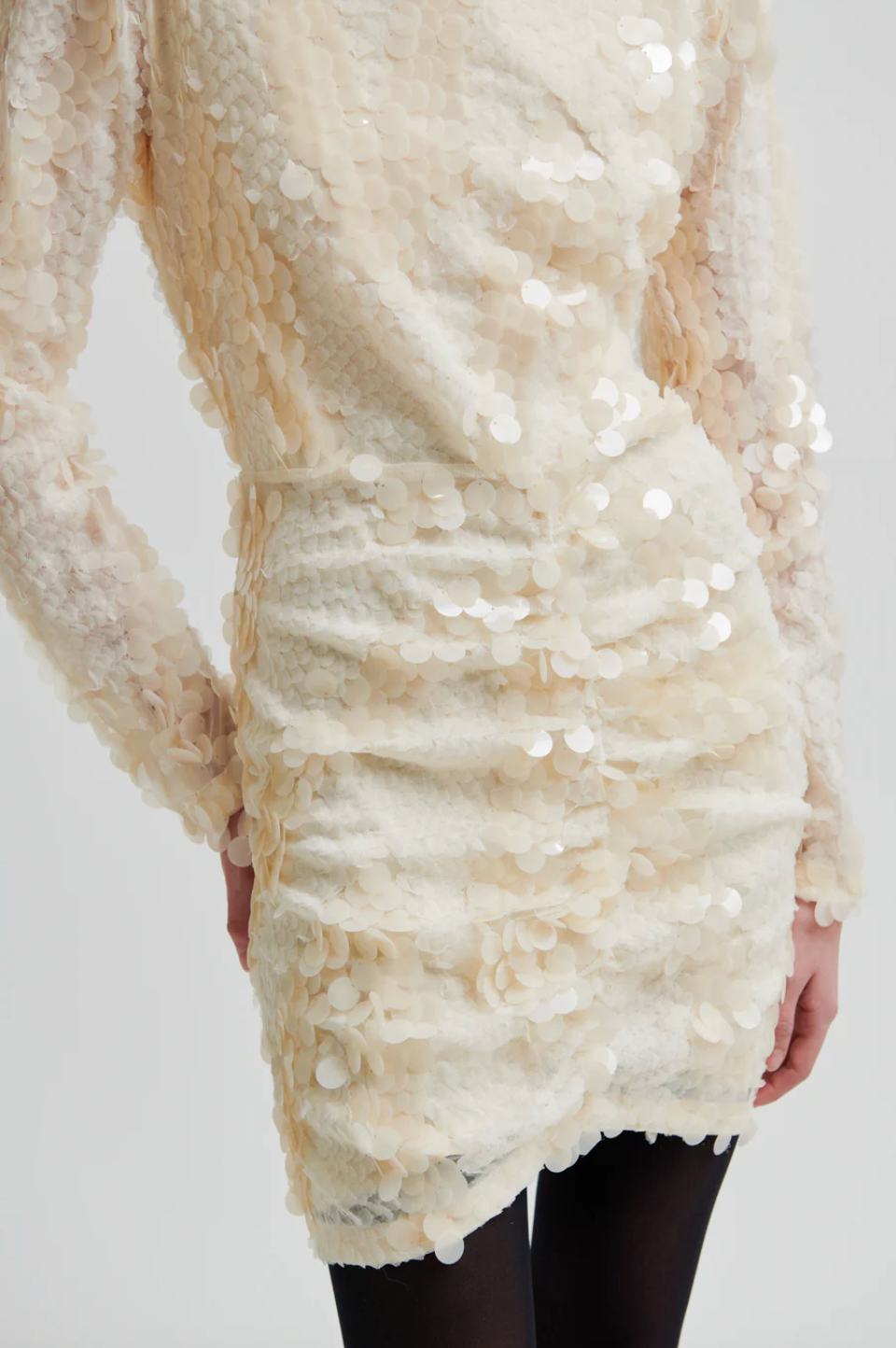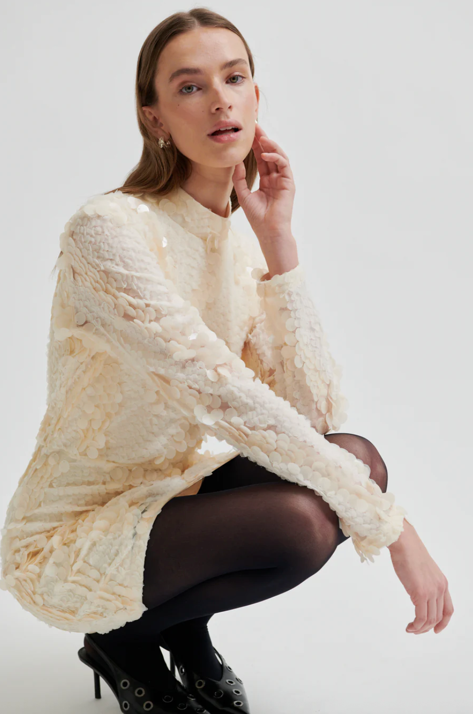 Second Female paljettkjole. Kjolen kombinerer glitrende paljetter og gjennomsiktig 3D-stoff på en ton-i-ton mesh-bakgrunn. Har høy hals og glidelåslukking bak. Rynket søm foran. Skulderputer og lange ermer. Fôret kropp. Slim fit.