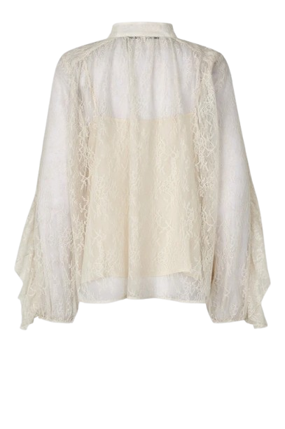 Second Female lagdelt blondebluse. Blusen er laget i gjennomsiktig blonde med en avtakbar underkjole i forskjellige farger. Med knappelukking foran. Vide ermer med vridde rysjer og elastiske mansjetter. Vanlig underkjole med et løst lag øverst.